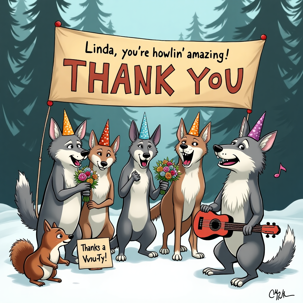 At the top of the cartoon image: "Linda, you're howlin' amazing — thanks a wolf-ton!"