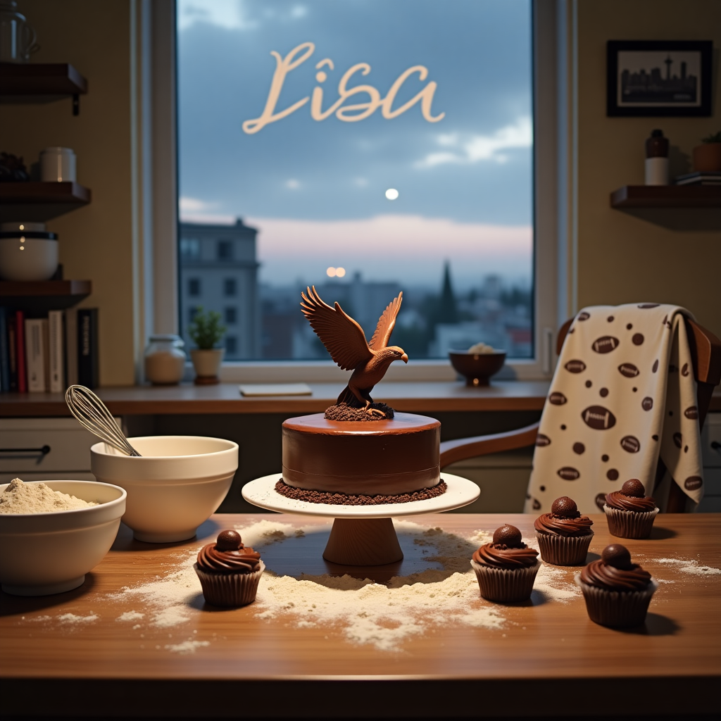 In the center of the scene, a wooden kitchen table is covered with an array of baking ingredients and finished confections. The table is dusted with a light sprinkling of flour, and there are large mixing bowls filled with batter, a whisk resting on the rim of one. To the right, a freshly baked chocolate cake sits proudly on a cake stand, its glossy ganache glistening under the soft glow of the kitchen's pendant light. On top of the cake, a single, delicate chocolate sculpture shaped like a soaring seahawk captures the eye, meticulously crafted with feathered details and a dynamic pose as if taking flight. Scattered around the cake are several cupcakes, each topped with a swirl of rich chocolate frosting and a tiny marzipan football, a nod to the Seahawks' spirit. Behind the table, a window overlooks a serene, twilight sky, where the word "Lisa" appears softly etched among the wispy clouds, as if written by an invisible hand. A cozy apron hangs over the back of a chair, its fabric adorned with small illustrations of footballs and chocolate chips, further tying the themes together. In the background, a shelf lined with cookbooks and a small framed photo of the Seattle skyline adds a personal touch, completing this harmonious blend of gratitude, culinary art, and team spirit.