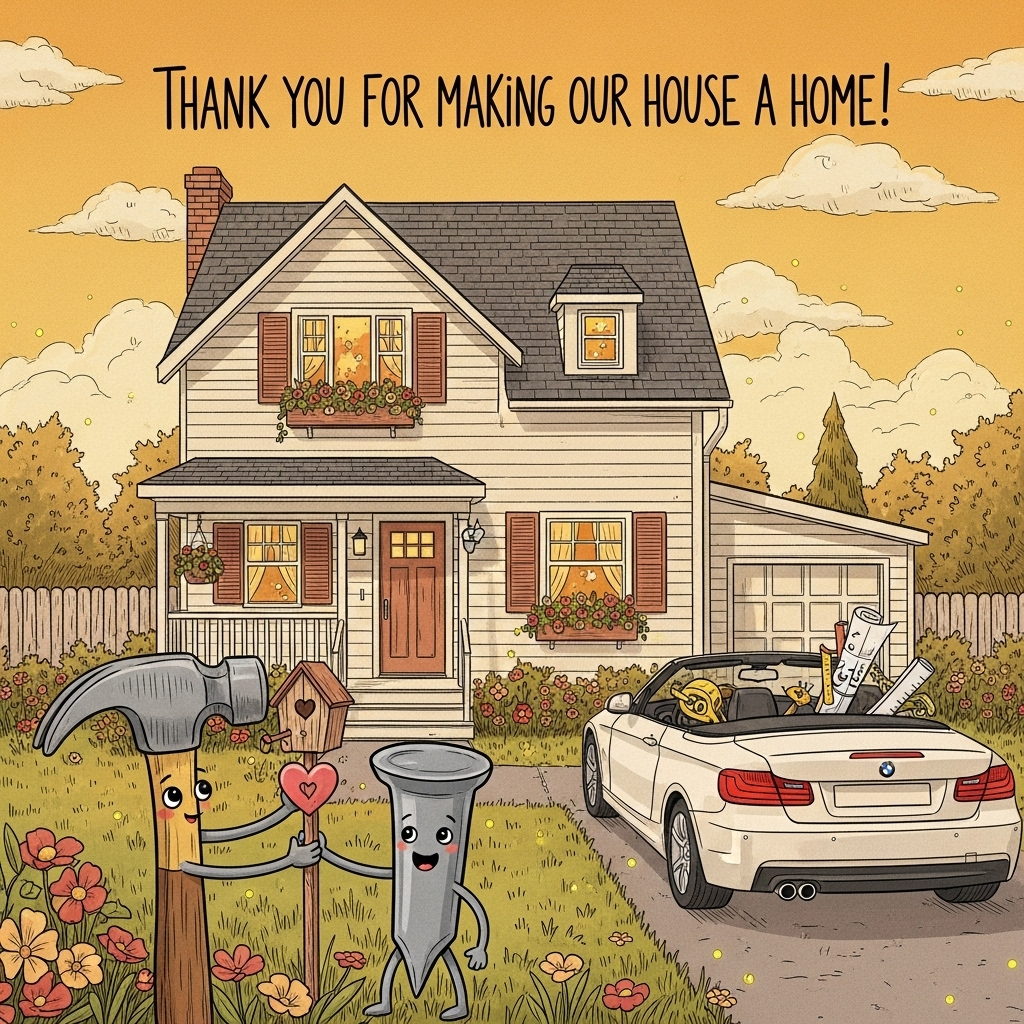 A warm, whimsical hand-drawn illustration scene: in the soft glow of a golden sunset, a charming, newly-built little house sits surrounded by a blooming garden where tiny fireflies dance in the twilight. A cute white BMW convertible is parked in the driveway, its roof down and a tape measure and blueprint roll peeking out from the passenger seat. In the foreground, an adorable hammer and a smiling nail (with expressive cartoon faces) are working together cheerfully— the hammer holding a tiny heart-shaped nail to fix a little birdhouse on the porch. The house has charming design details: freshly painted shutters, flower boxes under the windows, and a welcoming front door. The warm, textured colors bring out the cozy, “home sweet home” feeling, with fine linework capturing every detail. Fireflies twinkle throughout the yard like tiny fairy lights, adding a magical, heartfelt atmosphere.