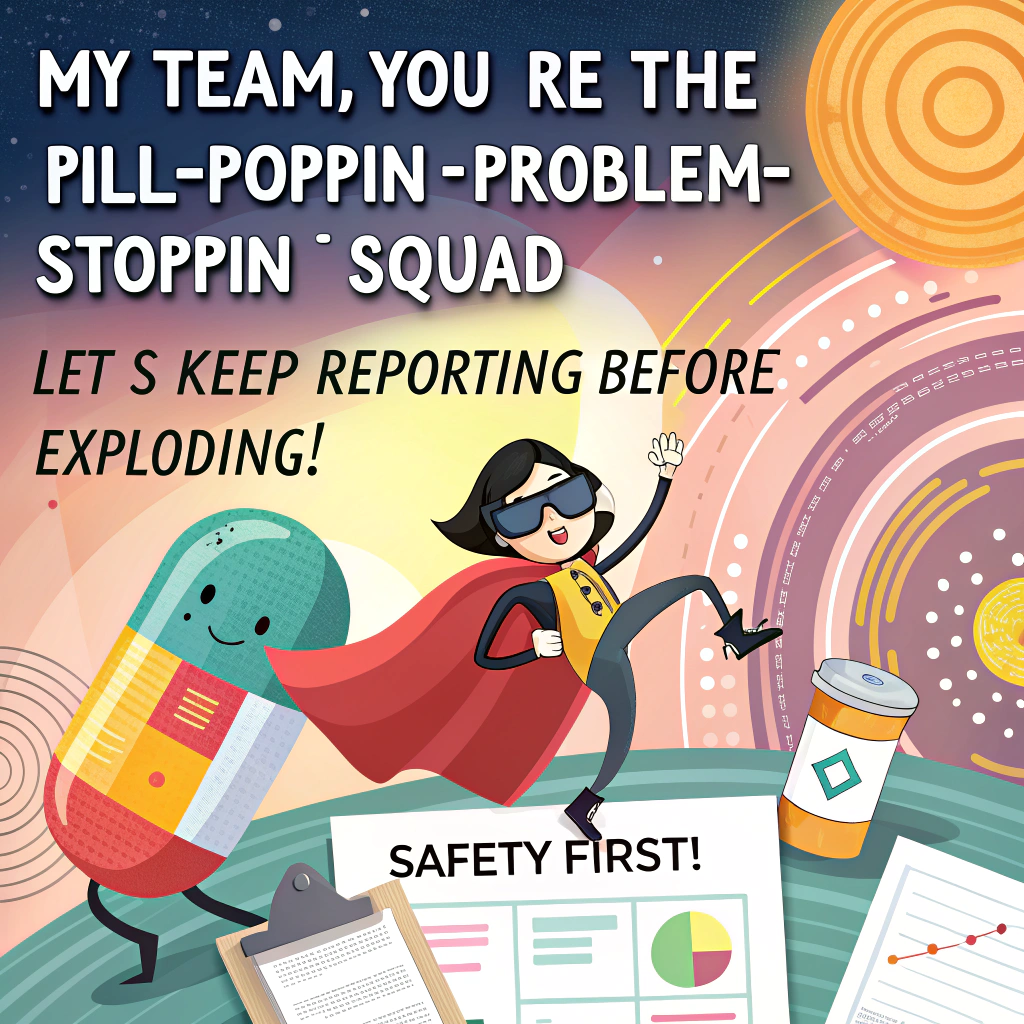 - In the center of the image, depict a vibrant abstract collage: A dancing medicine capsule wearing sunglasses and a superhero cape is surfing down a swirling vortex of colourful prescription labels, barcodes, and charts. The capsule holds a clipboard that reads "SAFETY FIRST!" while dodging cheeky hazards like a rogue banana peel labelled "INCIDENT" and a sneaky little bacteria cloud.