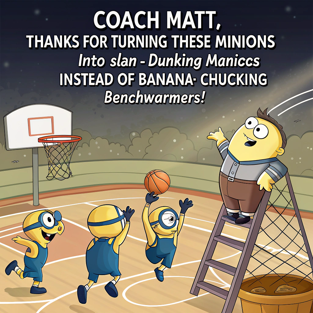 At the top of the image, "Coach Matt, thanks for turning these Minions into slam-dunking maniacs instead of banana-chucking benchwarmers!"