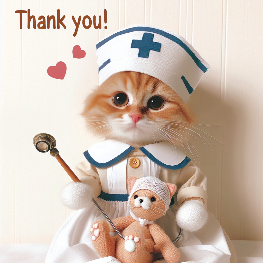 Create an image capturing a heartwarming scene featuring a cute ginger cat dressed in classic nursing attire, including a small cap antique in its endearing charm. The cat is seen gently holding a cartoonish representation of a protective tool with paw, symbolizing commitment and guard. Suspended above the cat are the uplifting words, 'Thank You!', echoing its heartfelt gratitude. The feline's soft gaze and gentle facial expression radiate a powerful sensation of earnest admiration and appreciation.