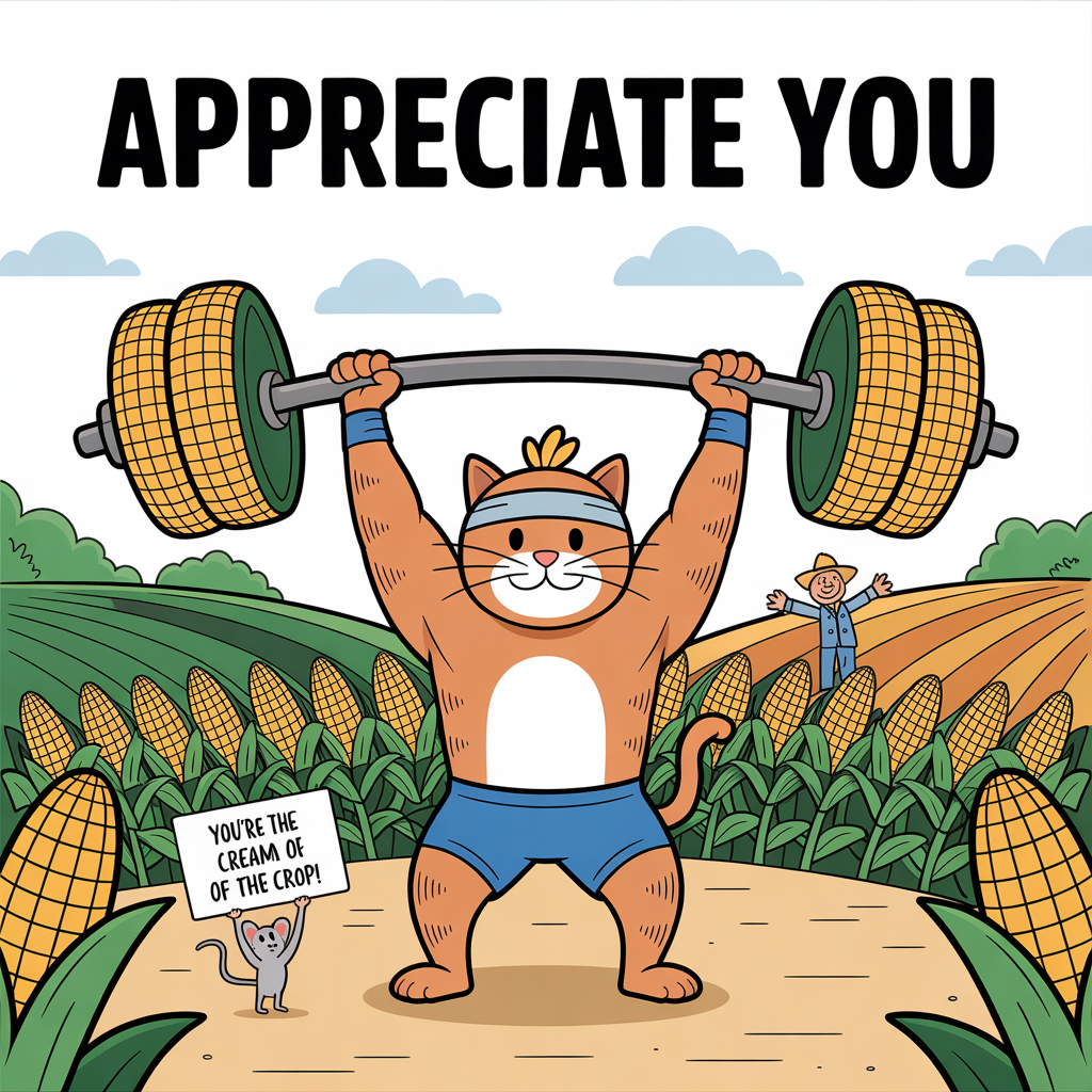 In the center of the image, create a scene with a muscular cartoon cat sporting a sweatband and lifting a heavy barbell made of ears of corn. The background should feature rolling Iowa cornfields, and in the distance, a farm with a playful scarecrow waving. Add a touch of whimsy with a small mouse acting as the cat’s personal cheerleader, holding a sign that says, "You're the cream of the crop!"