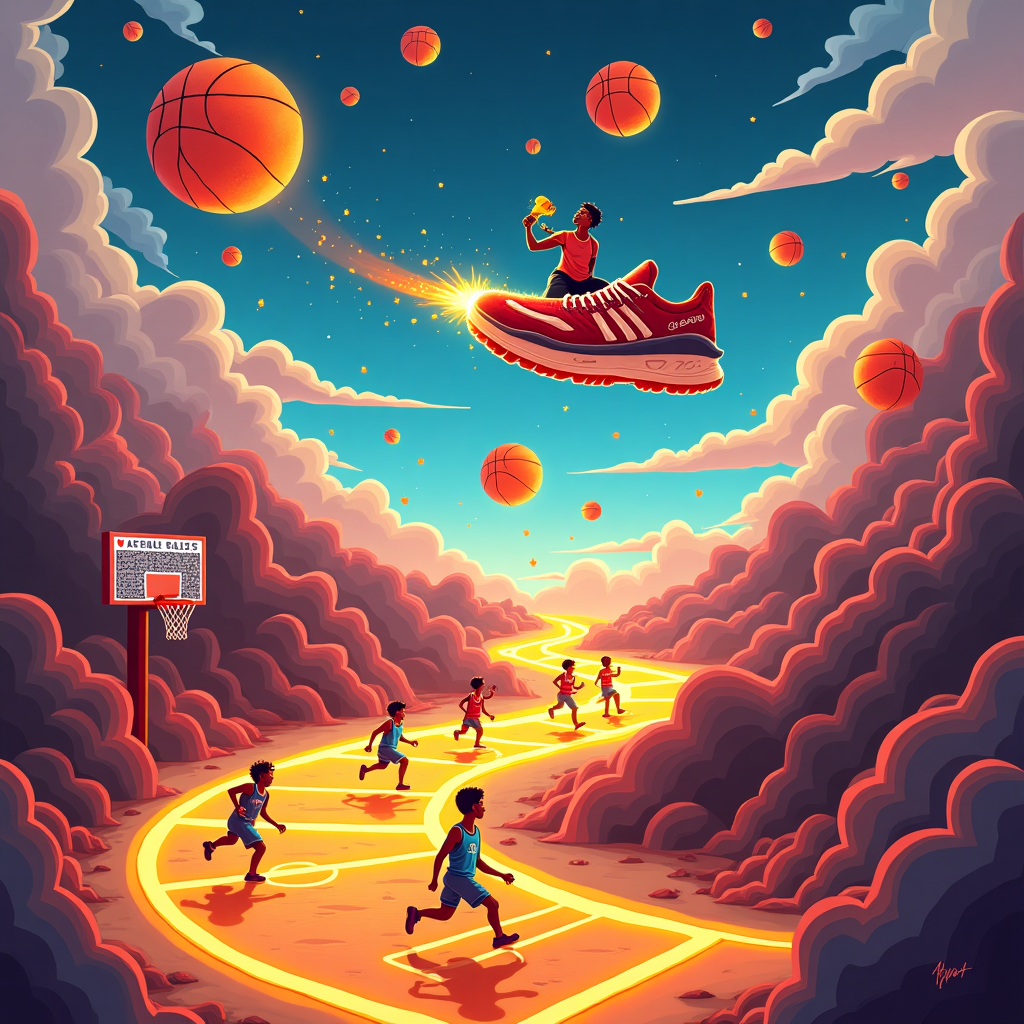 Along the trail, a squad of determined, slightly abstract U14’s Blazers players (think human figures with basketball-textured skin and flaming jerseys) charge forward on rocket-powered basketballs. In the lead, a larger-than-life Coach Adam is seen piloting a comically over-sized basketball sneaker shaped like a blimp, blowing a referee’s whistle that shoots confetti and miniature trophies into the sky.