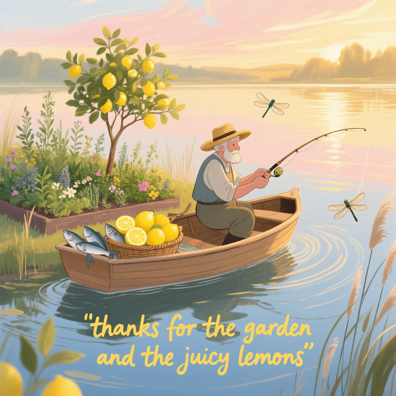 A hand-drawn, textured illustration of a tranquil lakeside scene at golden hour: a wooden rowboat gently bobbing on the ripples, an elderly fisherman in a straw hat casting a line, his basket on the shore brimming not only with fresh-caught fish but also unexpectedly full of bright, sun-gold lemons. Behind him, a lush little garden patch spills over with herbs, flowers, and a small lemon tree, its fruit glinting in the warm light. Dragonflies skim over the water, and the soft reflection of the sky shimmers in shades of peach, gold, and soft blue. Fine linework and expressive brush strokes bring gentle movement to the reeds and water, with a balanced, heartfelt composition that feels sincere, peaceful, and grateful.