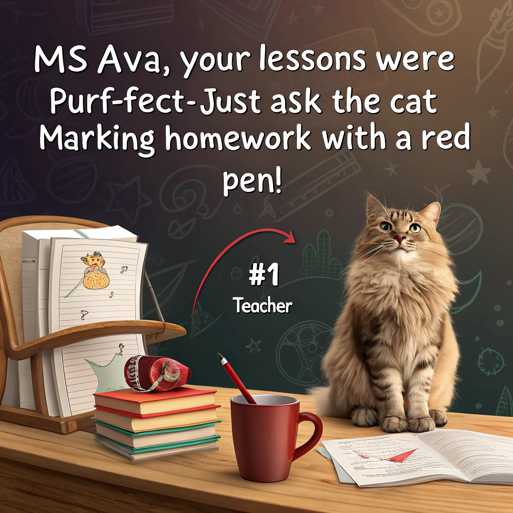 At the top of the image, "Ms Ava, your lessons were purr-fect—just ask the cat marking homework with a red pen!"