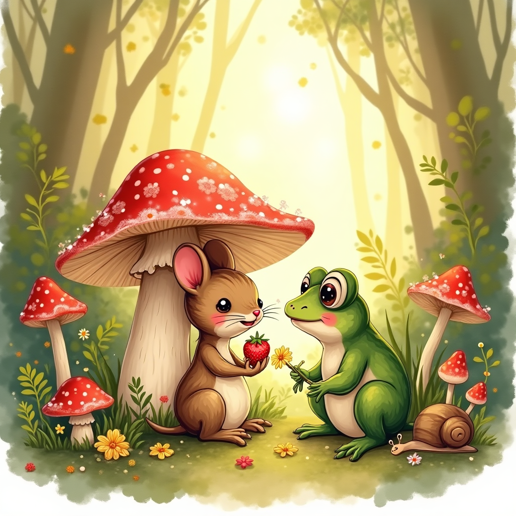 Hand-drawn illustration style with fine sepia linework and textured watercolor/gouache brush strokes; warm, expressive palette (mossy greens, terracotta reds, warm cream, soft blush, saffron sunlight). A cute golden-hour forest-floor scene: a tiny brown rat on tiptoe offers a wild strawberry and a daisy to a shy green frog; both snuggle under a big red-and-white toadstool like an umbrella. Surround them with clusters of mushrooms, clover, and curled fern fronds, sparkling dewdrops, a friendly snail peeking in; soft dappled sunbeams, shallow depth-of-field bokeh, gentle vignette. Rosy cheeks, bright beadlike eyes, whimsical expressions. Balanced composition with the pair centered, lots of lush detail and tactile paper grain, delicate hatching; vertical portrait, full-frame, minimal empty space except a little room near the bottom for a tiny caption. No photorealism, no harsh shadows, no extra text or logos.