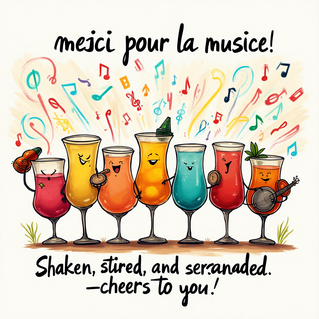 Create a whimsical scene of a choir of colorful cocktail glasses, each with expressive faces and tiny musical notes floating around them. The glasses are "singing" harmoniously, with some glasses holding miniature instruments like maracas and tambourines. In the background, abstract swirls of vibrant colors dance like sound waves, embodying the joyous spirit of music. Add a cheeky text caption at the bottom: "Shaken, stirred, and serenaded—cheers to you!"