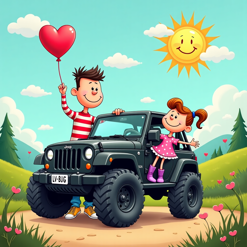 The scene features a couple standing joyfully behind a sleek, cartoonish black Jeep Wrangler, parked amidst a whimsical, fantastical setting. The Jeep is exaggeratedly bulky with oversized tires, a shiny chrome grille, and comically large headlights that gleam like friendly eyes. The car's license plate humorously reads "LV-BUG."