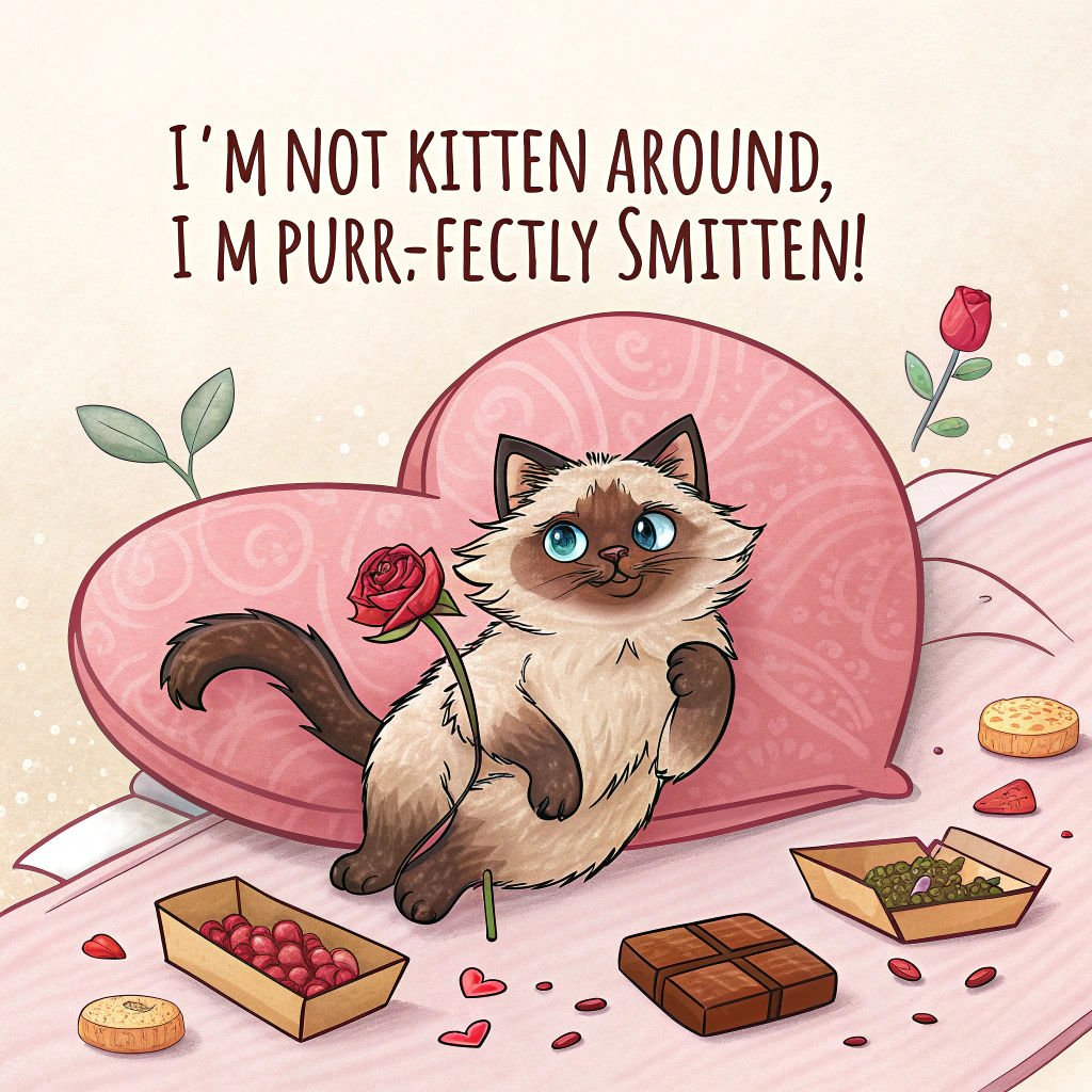 At the top of the image, "I’m not kitten around, I’m purr-fectly smitten!"