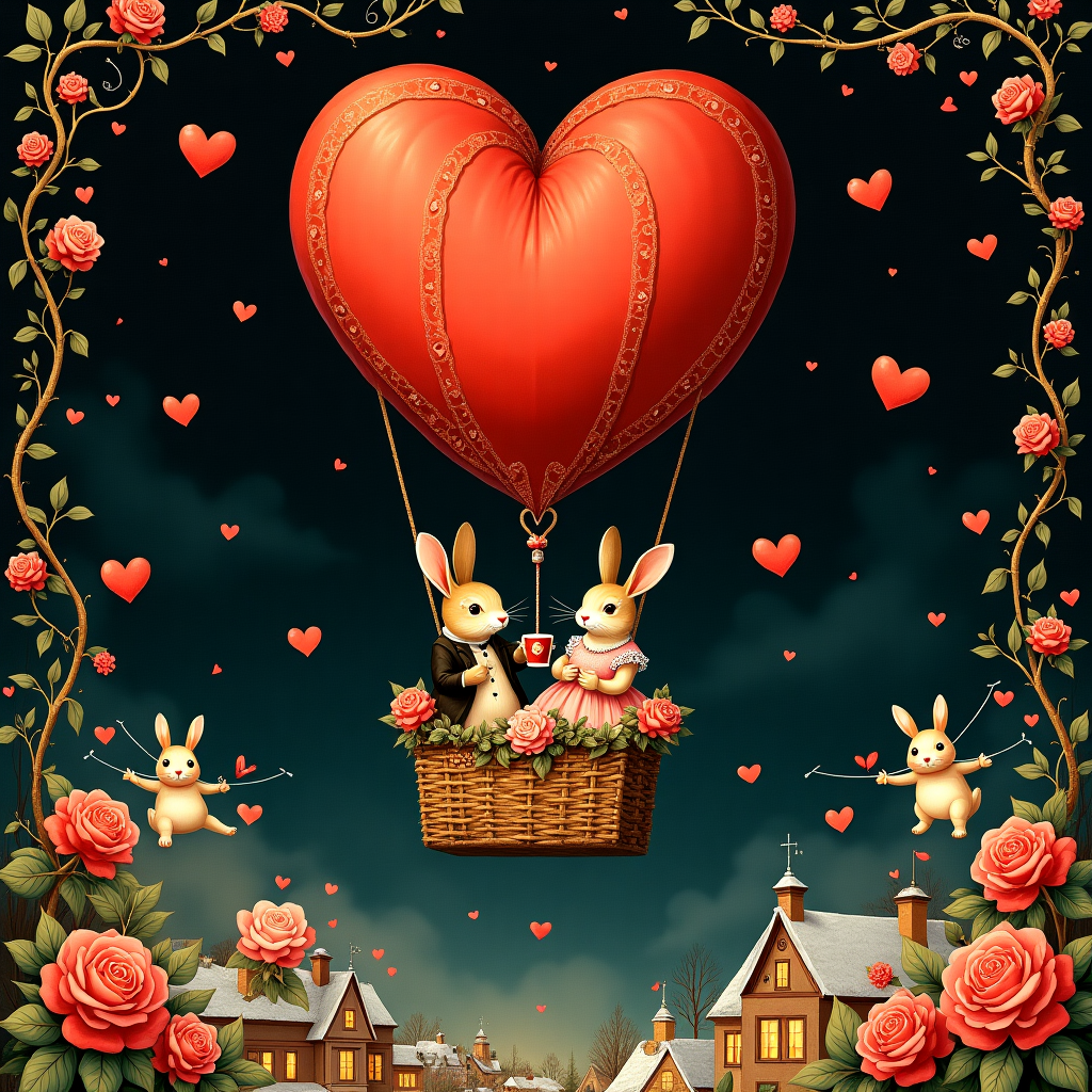Inside the basket, two charmingly anthropomorphic rabbits, inspired by Beatrix Potter's endearing characters, are cozily seated. The rabbits are elegantly dressed, the gentleman rabbit in a dapper waistcoat and the lady rabbit in a flowing, lace-trimmed gown. They hold tiny, steaming cups of cocoa, each cup painted with heart motifs.