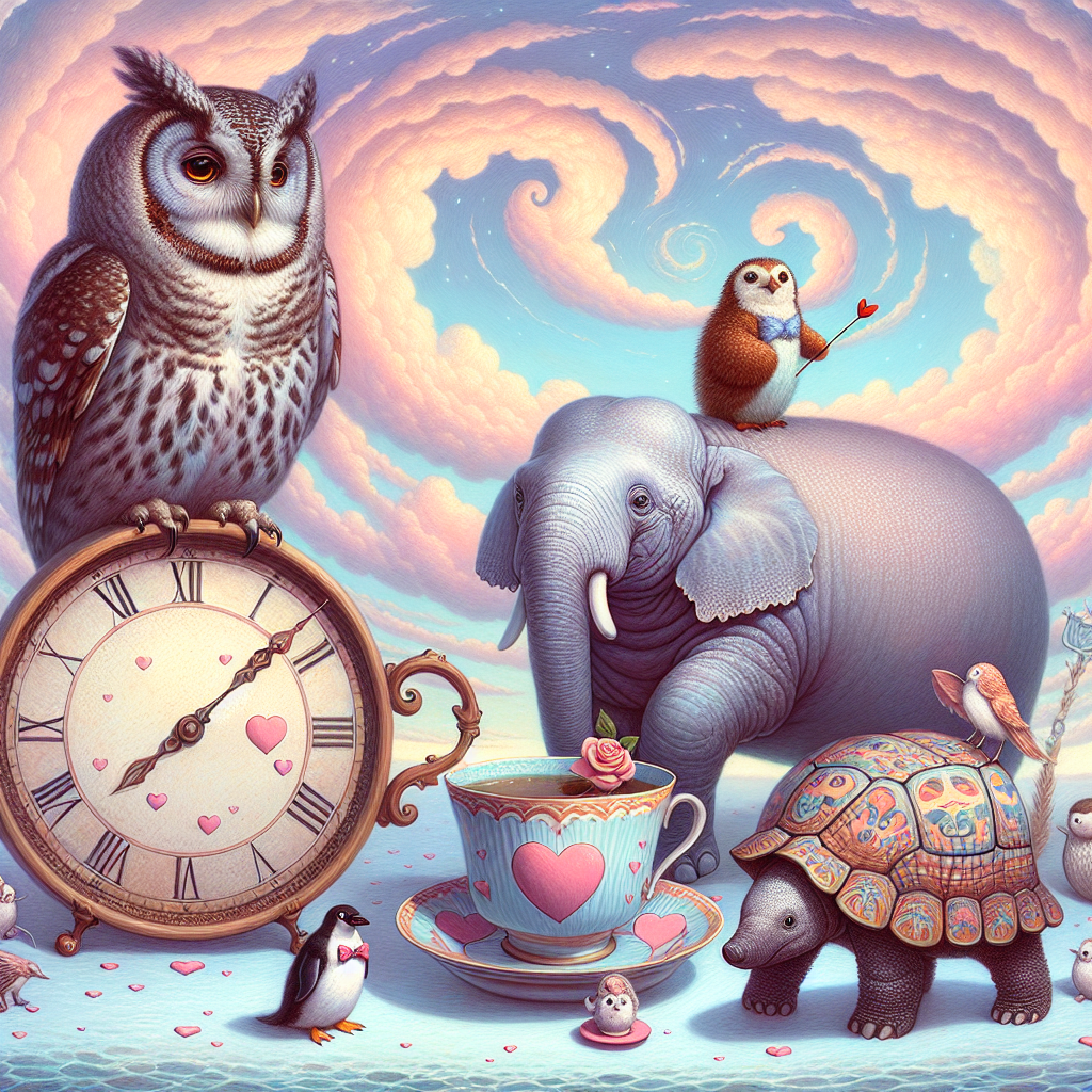 Picture a dreamlike landscape with swirling pastel-colored skies. An owl, full of wisdom yet adorable, perches atop an oversized teacup. This owl glances affectionately at a manatee who has a unique heart-shaped spot. On the sidelines, an armadillo, dressed in an abstractly numbered jersey, turns itself into a ball that carries a pattern of tiny Cupid figures. Joining this unusual gathering is a penguin, proudly wearing a bow tie and carrying a rose in its flipper. Interestingly, it stands atop a timepiece, the hands of which curiously point to the date February 14th. This whimsical gathering appears like an enchanting Valentine's day celebration in the form of a tea party.