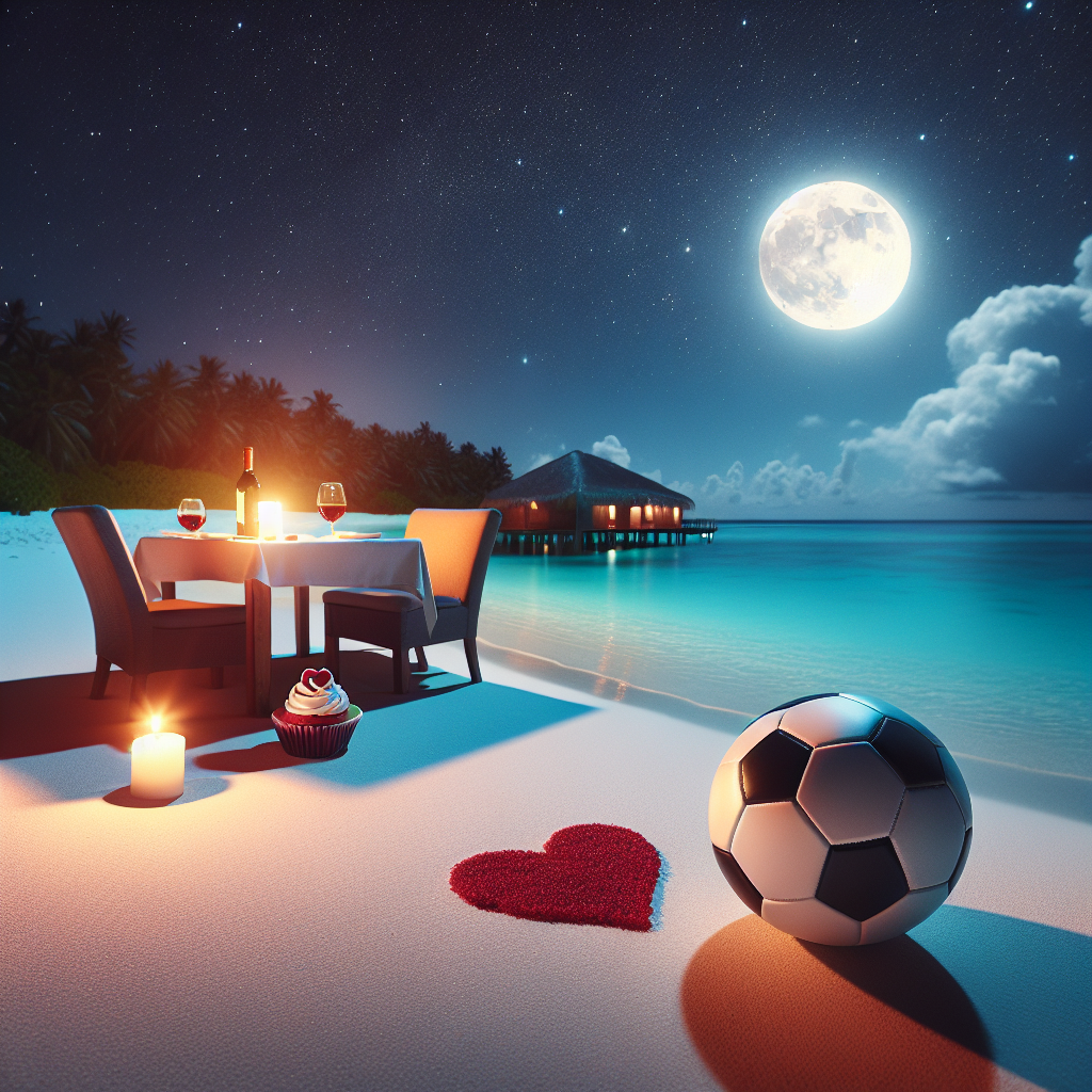 Depict a beautifully serene scene on a beach in the Maldives bathed in moonlight. There is a heart-patterned soccer ball settled in the sandy foreground. Further away, subtly resting in the background, is an inviting scene set for a romantic rendezvous - a cozy table for two, highlighted by the presence of a chilled bottle of wine and an adorable football-themed cupcake. The sky above is brilliant with stars, suggesting a warm, unsettling silence of the night, hinting the essence of romantic Valentine's Day. The soothing whisper of the tranquil sea subtly enriches the romantic ambiance.