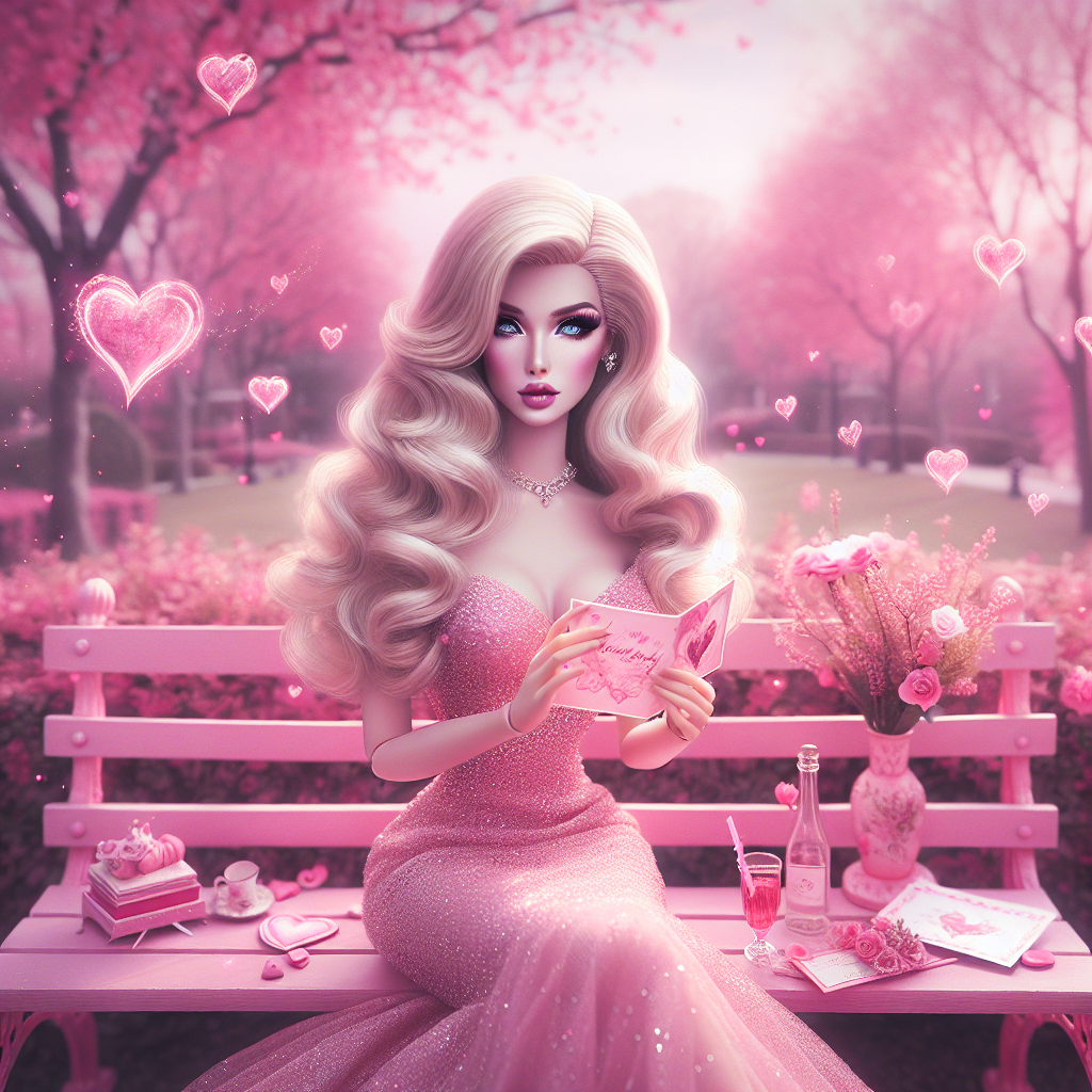 In this enticing scene, a blonde lady with doll-like features is perched on a pink bench, a Valentine card held delicately in her hands. The park around her is awash in a rosy hue. Pink trees and flowers, kissed by the soft light, lend the setting a dreamy aspect. A flurry of whimsically illustrated pink hearts dances around her, adding a layer of magic to the scene. She's outfitted in a classic, sparkling pink gown, a perfect ensemble for a Valentine's Day-themed setting.