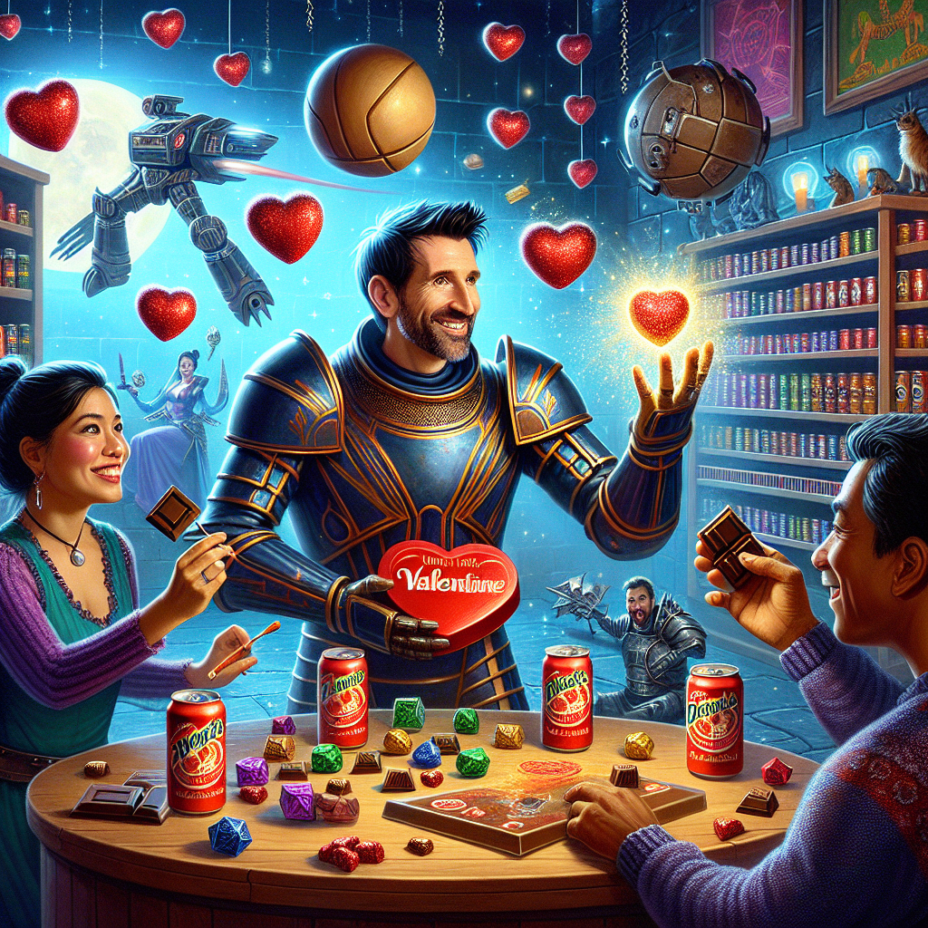 Celebrating Valentine's Day, this vibrant scene merges romance with an appreciation for games and escapades. Central to a magical dungeon, a character inspired by a popular British sci-fi series holds a piece of chocolate, dodging small enchanted footballs that twinkle with sparkles. Dungeon walls showcase shelves packed with cans of energizing beverages and age-old relics, hinting at a mix of dynamism and archaeology. At his feet, a charismatic couple in full armor - a Hispanic woman and a South Asian man - play a game resembling a well-known tabletop RPG, their mirth and camaraderie resonating throughout.