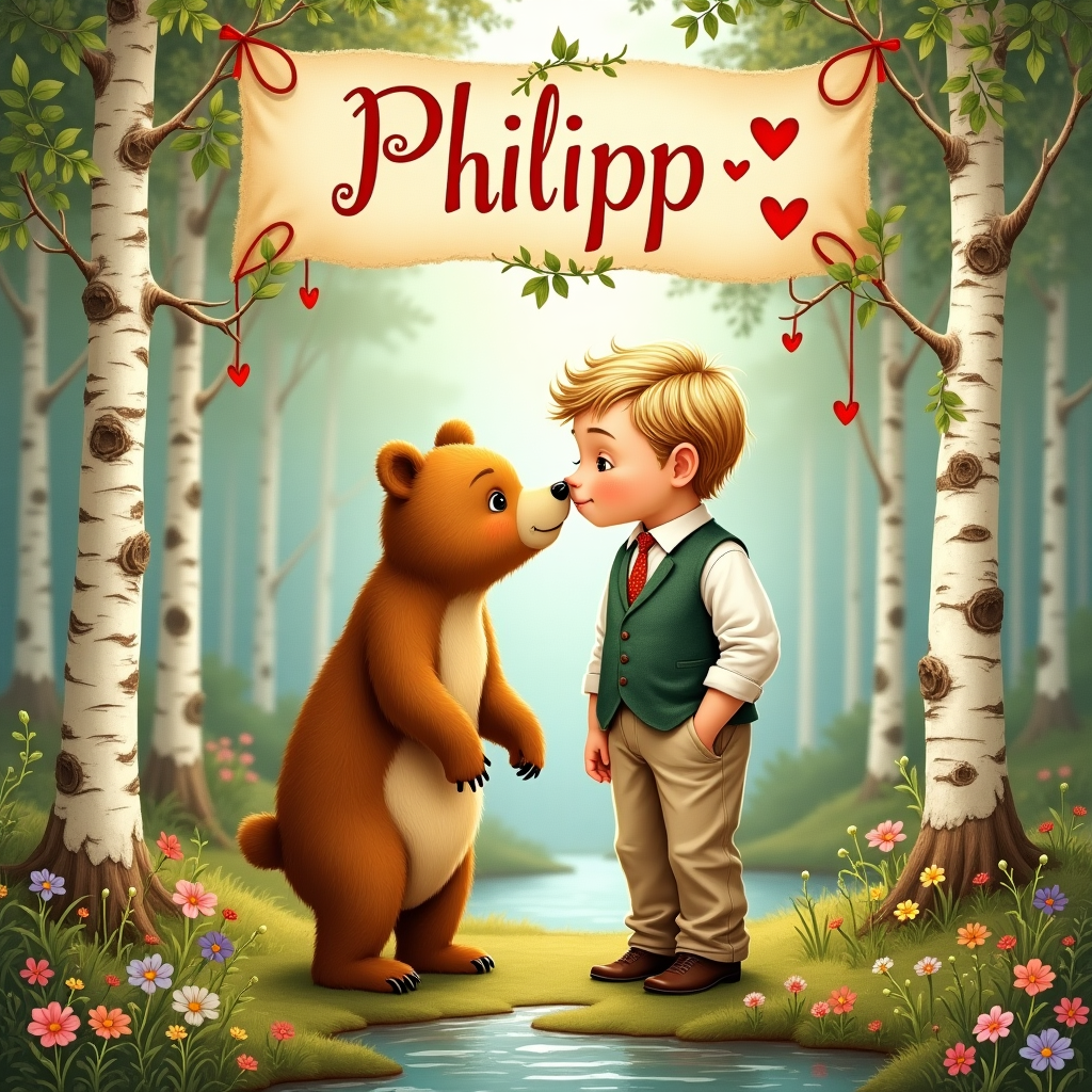 Above the scene, a banner elegantly swoops between two trees. The banner is a parchment-like cream color, with edges delicately curled as if aged. In a calligraphy style reminiscent of Aubrey Beardsley's art, the name "Philipp" is scripted in deep crimson ink, standing out against the soft backdrop. Small hearts and tendrils of ivy are artfully illustrated around the text, adding a whimsical touch.
