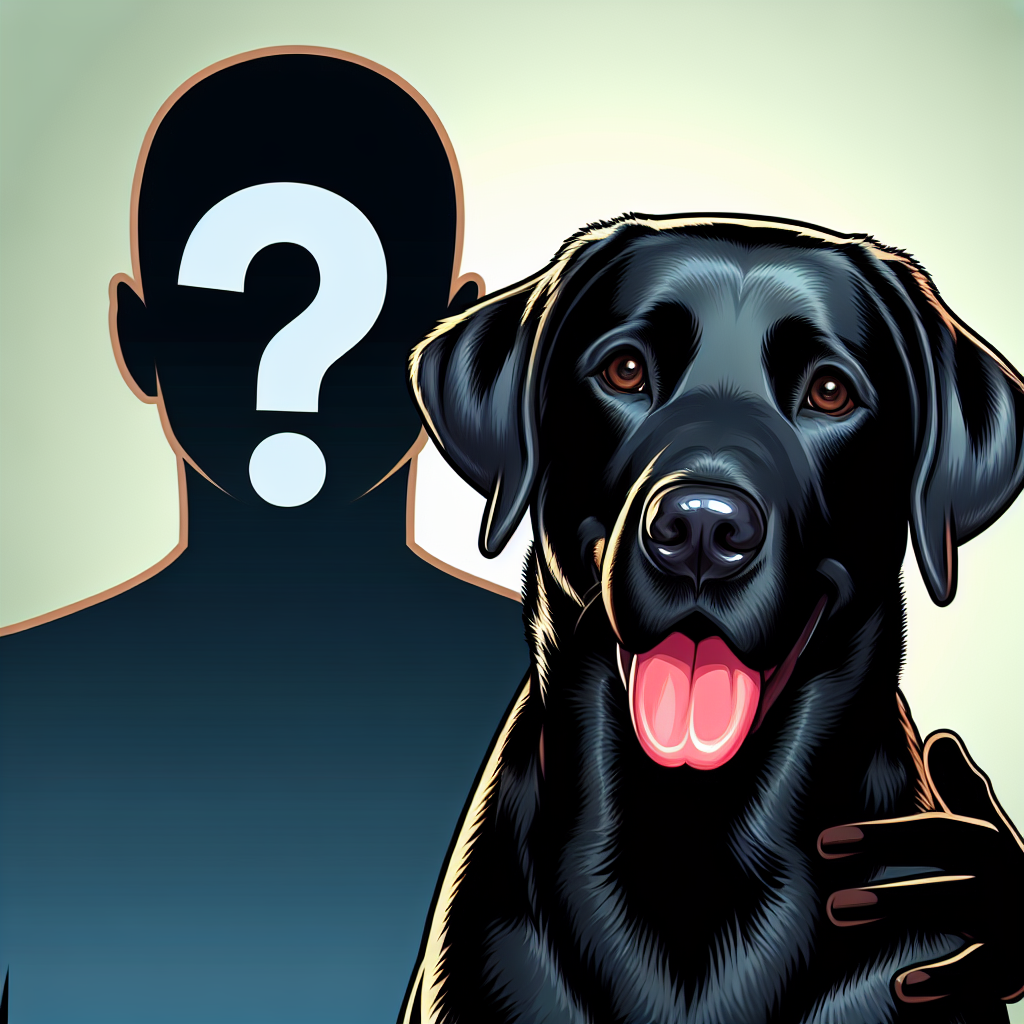 Create an endearing cartoon image in a non-specific style. In the scene, an enigmatic, undefined figure co-stars as our main character. The key character sharing the spotlight is a well-built, large, adult Labrador Retriever. The Labrador, a real beauty with glossy black fur that seems to glisten, possesses affectionate brown eyes. The eyes radiate a palpable sense of loyalty and kindness, exuding the characteristic charm that Labradors are so famously known for.