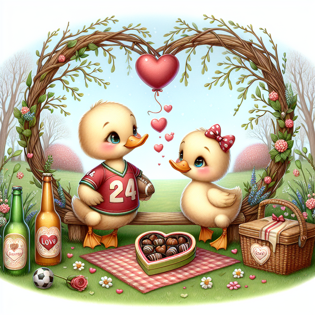 This illustration is designed to evoke feelings of love and affection for Valentine's Day. In this charming park setting, two cute ducks are depicted. One duck dons a small football jersey, carrying a miniature football under its wing, and looks lovingly at the other duck. A picnic, placed in the foreground, includes a heart-shaped box of chocolates. Additionally, there are two bottles of beer with fanciful bubbles rising in the shape of hearts from them. The whole image is beautifully framed by a wreath made of intertwined twigs and leaves, it is heart-shaped symbolizing the spirit of love and whimsy.