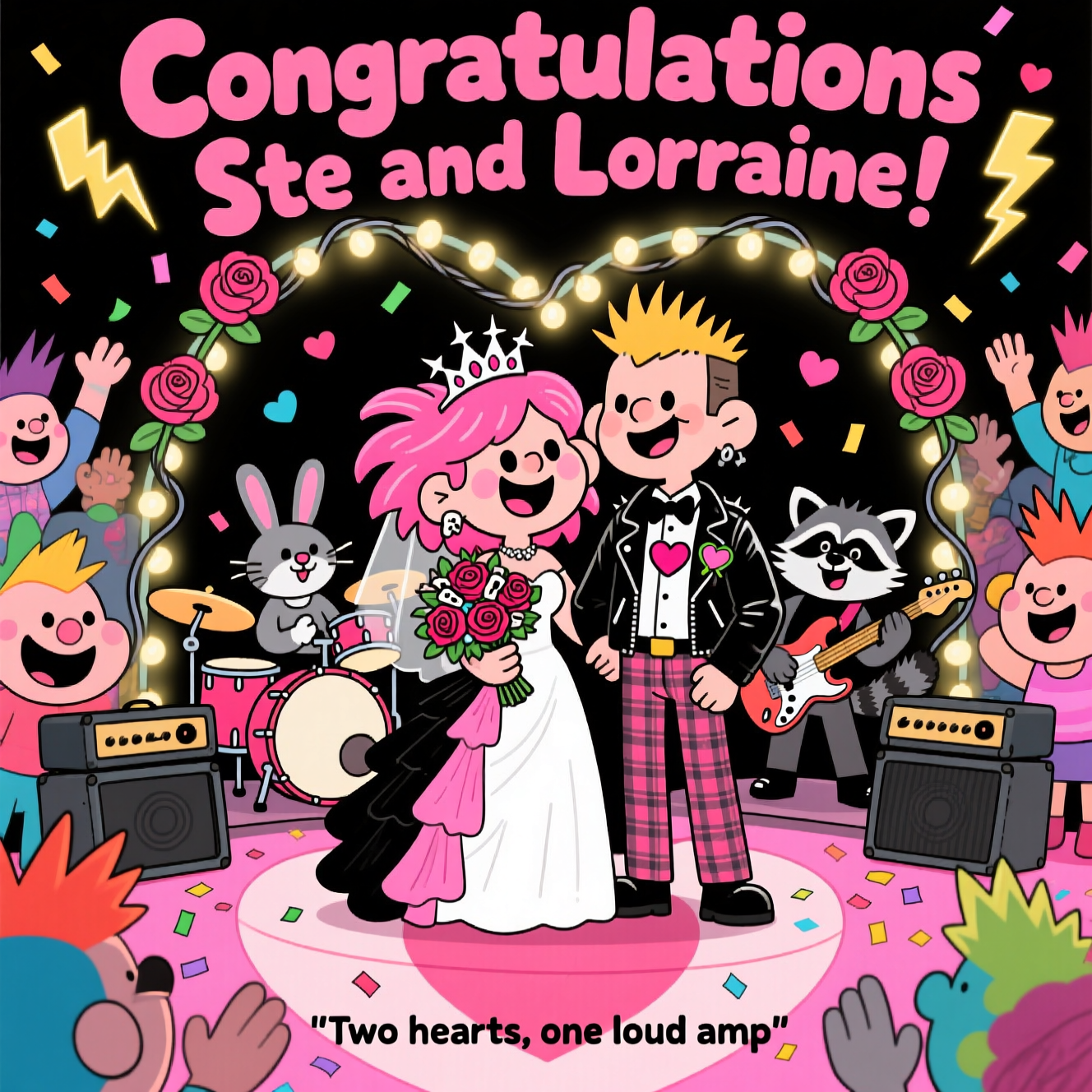 A vibrant, romantic cartoon scene of a punk rock wedding: the bride and groom are adorable, exaggerated cartoon characters with big, beaming smiles and slightly oversized heads. The bride wears a white dress with a cascade of pink and black tulle, a spiked tiara over her wild candy-pink hair, and a bouquet of roses mixed with tiny guitar picks. The groom wears a black leather jacket over a crisp shirt, tartan trousers, and a heart-shaped safety pin boutonniere. They’re standing on a whimsical heart-shaped stage made of amplifiers, under a glowing arch of fairy lights and roses entwined with guitar cables. Behind them, a cartoon band of quirky animal characters — a cat on drums, a rabbit on bass, and a raccoon shredding an electric guitar — plays joyously. The crowd is full of cartoon friends with colourful mohawks, big smiles, and waving hands. Confetti shaped like tiny lightning bolts and hearts rains down.