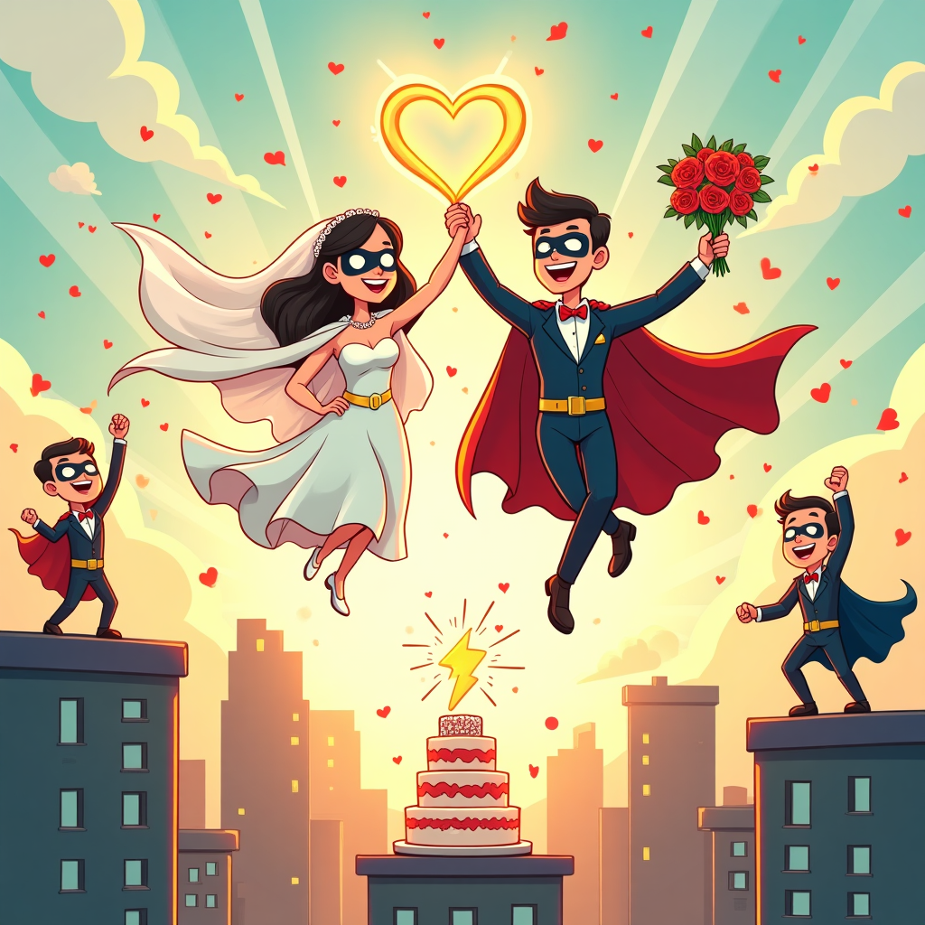 A funny, high-energy wedding scene in playful Cartoon Style: two original newlywed superheroes soar upward above a stylized city skyline that subtly resembles stacked wedding-cake tiers. Exaggerated proportions, thick black outlines, bright saturated colors. Their capes knot together behind them to form a big heart silhouette as they hold hands midair, grinning through simple masks. One hero wears a sleek white suit with a veil-like cape and gold accents; the other sports a navy hero suit with tuxedo lapel graphics and a flowing crimson cape. A radiant ring-glow crackles between them; a bouquet explodes into heart and lightning-bolt confetti. Cheerful sidekick pals on rooftops strike dynamic poses, tossing more confetti; tiny rocket-cans whoosh by for a humorous touch. Low-angle, wide shot; sunburst rays, halftone dots, and speed lines amplify the action. Clean, open sky for the title; full-bleed celebratory composition. No branded logos or known characters.