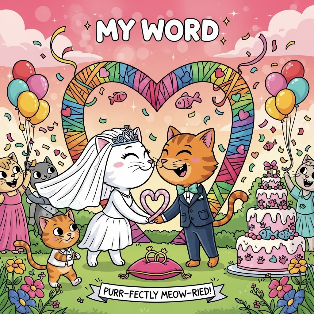 A romantic wedding scene starring two playful cartoon cats with exaggerated proportions, thick outlines, and bright saturated colors. Center stage: a fluffy white bride-cat with a flowing veil and heart-shaped tiara, and a dapper ginger tabby groom in a navy tux and mint bow tie. Their noses touch as their curly tails form a heart, energetic, joyful poses. They stand beneath a giant heart-shaped arch woven from oversized rainbow yarn. Heart- and fish-shaped confetti swirls through a warm pink-to-peach sky with twinkly sparkles and soft bokeh. A kitten ring-bearer toddles in with a fish-shaped velvet pillow holding golden rings. To one side, a towering tiered cake decorated with paw prints and tiny fish. Cat guests in colorful outfits toss confetti and wave ribbon streamers. Lush garden setting with stylized flowers and balloons shaped like hearts and fish. Clean cel shading, bold black outlines, playful, whimsical mood, full-bleed portrait composition.