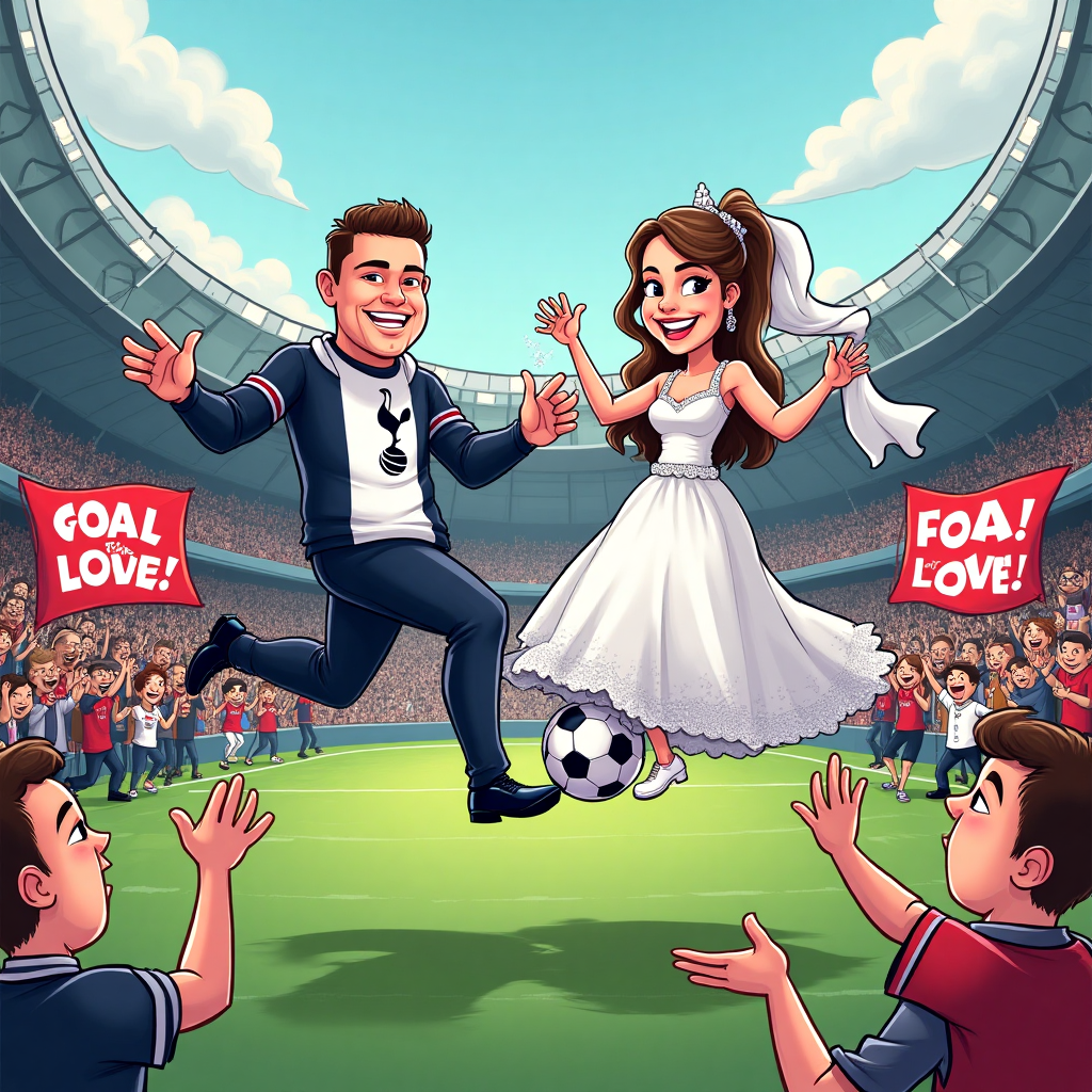 The scene unfolds at a cartoonized version of Tottenham Hotspur Stadium, with a whimsical twist. The bride and groom, Stevo and Chelsea, are depicted in exaggerated, playful cartoon form. Stevo is wearing a comically oversized Spurs jersey, while Chelsea dazzles in a wedding gown made to look like a Tottenham scarf. Both are jumping in the air, gleefully kicking a giant soccer ball together. Around them, a crowd of cartoon fans with happy, exaggerated expressions are cheering and waving banners that say "GOAL for Love!" in bold, bubbly letters. Bright, saturated colors and thick outlines add to the vibrant, celebratory atmosphere.