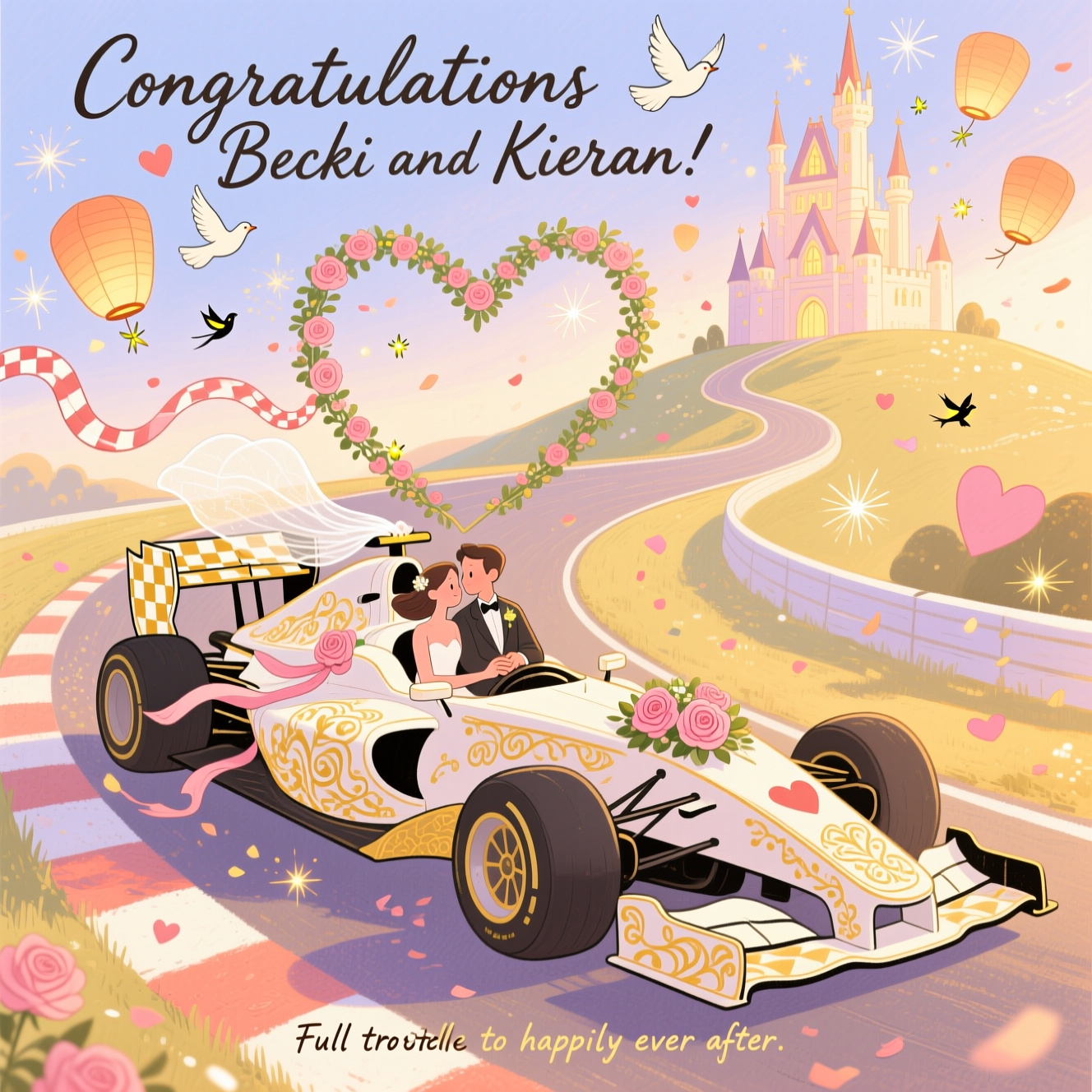 A romantic, hand-drawn illustration with fine linework and textured brush strokes, balanced composition, and a warm, expressive color palette. Foreground: an elegant open-wheel grand-prix car transformed into a whimsical wedding getaway, its streamlined body adorned with golden filigree, blush roses, silk ribbons, and a veil-like checkered ribbon curling from the rear wing. The newlyweds (tastefully stylized, no specific likeness) lean close, hands intertwined, bathed in a soft golden-hour glow. The racetrack sweeps around them into a heart shape, guiding the eye upward.