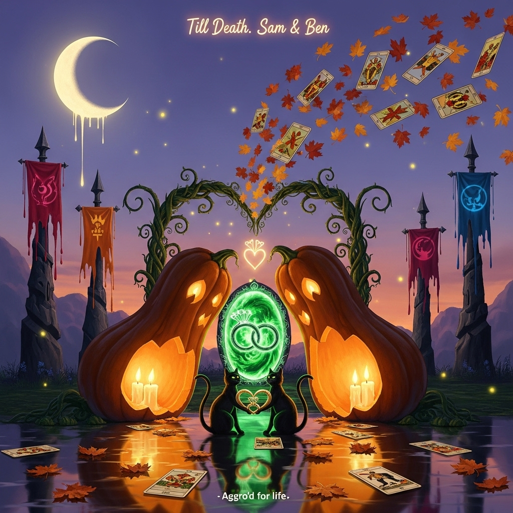 A Dali-inspired, dreamlike romantic autumn wedding scene: two monumental pumpkins lean together like newlyweds about to kiss, their candlelit interiors softly melting into one another as curling vines arc above to form a heart-shaped chapel arch. Fluttering amber and crimson autumn leaves morph midair into floating tarot cards—the Lovers card glows between them like a sacred vow. At the base of the arch sit two sleek black cats as ring-bearers, their tails looping into an infinity heart, eyes catching twin tiny moons.