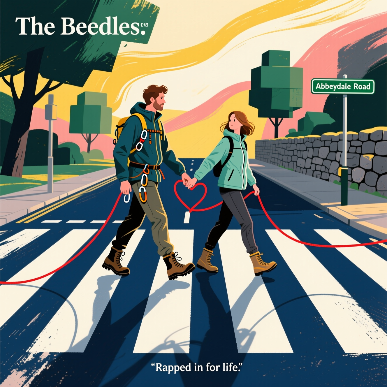 Generated with these themes: A knock of of the Abbey road The Beetles cover, with "The Beedles" instead and "Abbeydale Road", Mountaineering , Climbing , Outdoor gear, and .