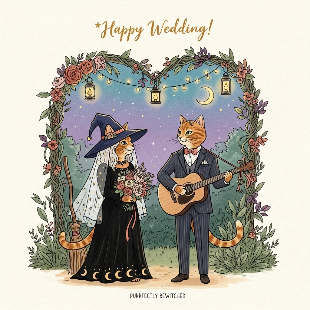 A sincere, hand-drawn illustration featuring an enchanting evening garden. Center stage: an anthropomorphic bride cat dressed as a witch and a groom cat serenading her with an acoustic guitar. The bride cat stands on the left beneath a heart-shaped arch of wild vines and soft florals; she wears a midnight-blue witch hat with a delicate star-dusted veil, a flowing black dress with subtle crescent patterns, and holds a bouquet of wildflowers in warm blush, cream, and sage. A small broom leans against the arch, adorned with a ribbon to feel romantic rather than spooky. The groom cat, on the right, wears a tailored tux with a soft bow tie; he strums the guitar gently, eyes lovingly meeting hers. A tiny ring ribbon is tied to the guitar headstock as a sweet detail.