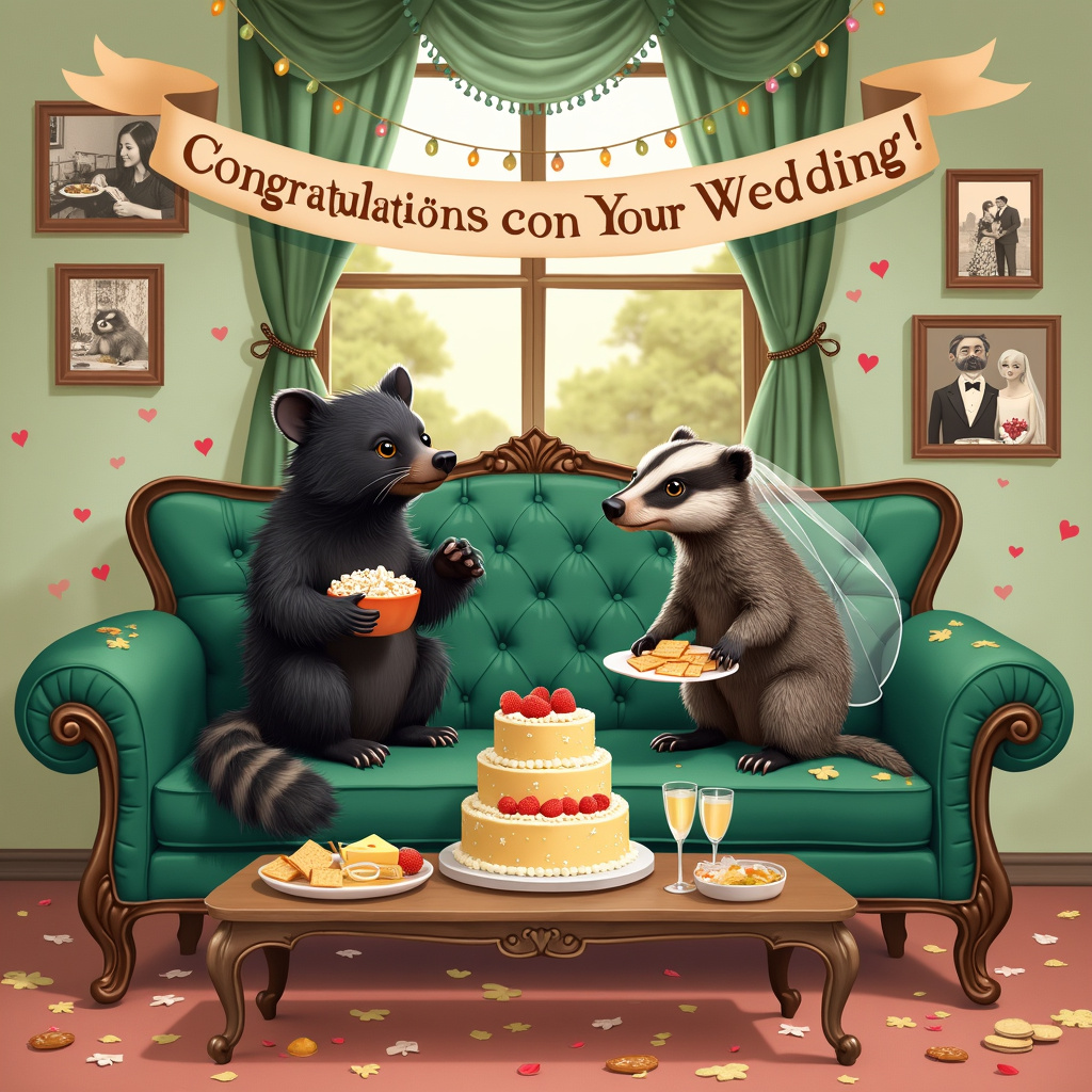 On the front cover of the wedding greeting card, a cozy living room scene unfolds with meticulous detail. A binturong and a badger are seated comfortably on a plush, vintage-style sofa upholstered in a rich, emerald green fabric with golden floral patterns. The binturong, with its shaggy black fur and prehensile tail, leans against the armrest, clutching a bowl of popcorn in its paws. The badger, its sleek, striped fur contrasting against the green upholstery, holds a plate laden with an assortment of snacks: cheese cubes, crackers, and miniature sandwiches.