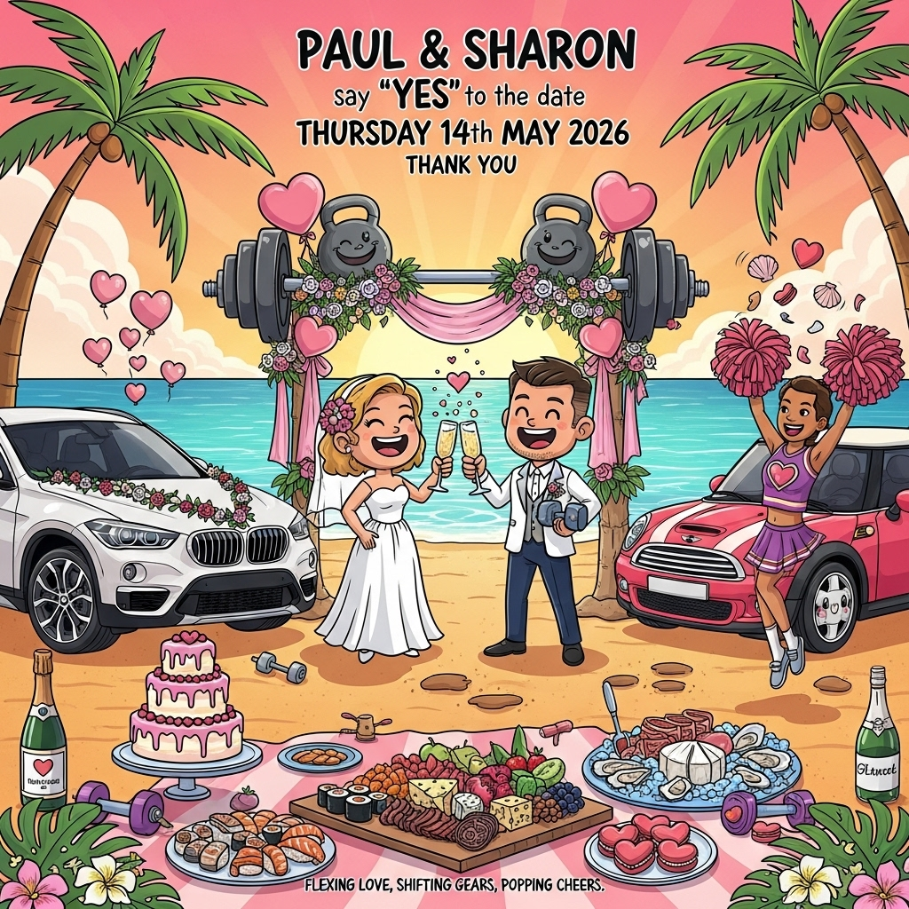 Romantic, playful Cartoon Style beach wedding at golden hour: center stage, an adorable couple with exaggerated proportions and thick outlines, bright saturated colors, laughing as he playfully “bench-presses” her like a heart-shaped barbell while she curls a tiny heart dumbbell; they clink champagne flutes, fizz bursting into sparkling hearts and stars. A palm-framed wedding arch built from a cartoon barbell with heart plates, kettlebell balloons, and ribbon streamers; turquoise sea, golden sand, and palm trees sway in a warm sunset glow. To the left, a shiny BMW X1 in pearl white, festooned with flowers and ribbons; to the right, two candy-colored Mini Coopers with big bows and cute wheel hearts. In the foreground, a joyful picnic-style feast: a tiered wedding cake, sushi, fruit platters, cheese and charcuterie, oysters on ice, and heart-shaped macarons, all rendered in bold outlines and juicy colors. An adult pom-pom cheerleader friend bounces in, shaking heart-shaped pom-poms, tossing seashell and dumbbell-confetti into the air. Whimsical touches: floating heart bubbles, sandy footprints, tropical blooms, and a soft rosy glow for a romantic mood. Style notes: playful cartoon characters, thick black outlines, glossy highlights, vibrant tropical palette, energetic poses, gentle vignette, portrait composition with breathing room for the top text.