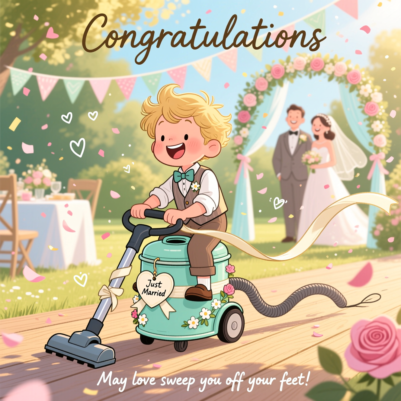 A cute, hand-drawn wedding illustration with fine linework, textured brush strokes, balanced composition, and a warm, expressive color palette (blush pinks, soft gold, sage green, powder blue). In a sunlit garden reception, the focal point is a small boy with tousled blonde hair, dressed as a page boy (tiny waistcoat, bow tie, rolled-up sleeves), giggling as he rides atop an unplugged vintage canister vacuum cleaner painted pastel teal and decorated with ivory ribbons, tiny flowers, and a “Just Married” heart tag. He’s being gently pulled around by a silky ribbon tied to the vacuum handle; the ribbon leads back to the newlyweds in soft-focus mid-background, smiling beneath a floral arch and bunting. Confetti and rose petals swirl like sparkling motes, with little heart doodles accenting the motion; dappled golden light, soft shadows on a wooden deck, and subtle paper-grain texture. Joyful expressions, playful motion arcs, and a cozy, whimsical mood.